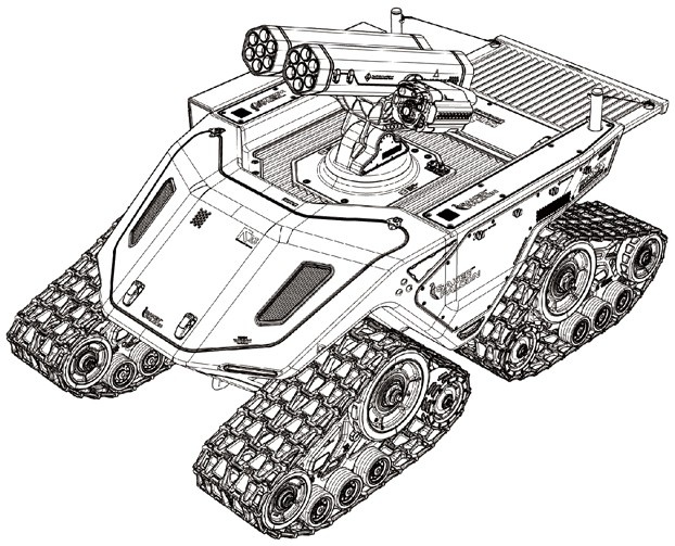Немалый акцент в архитектуре образца уделен снижению заметности в РЛ и ИК диапазонах. В левой надгусеничной полке на корме отсек для БПЛА.